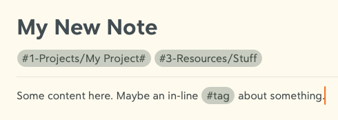 Some tags can make sense in-line within the body of a note. However, that’s never going to be the case for a string like “#1-Projects/My Project#“ … which is why I have a “section” at the top of my note for them. The app is kind enough to support drag-and-drop for tags, but this results in new tags appearing at the BOTTOM of my notes, while I (like many others) prefer them at the top.
