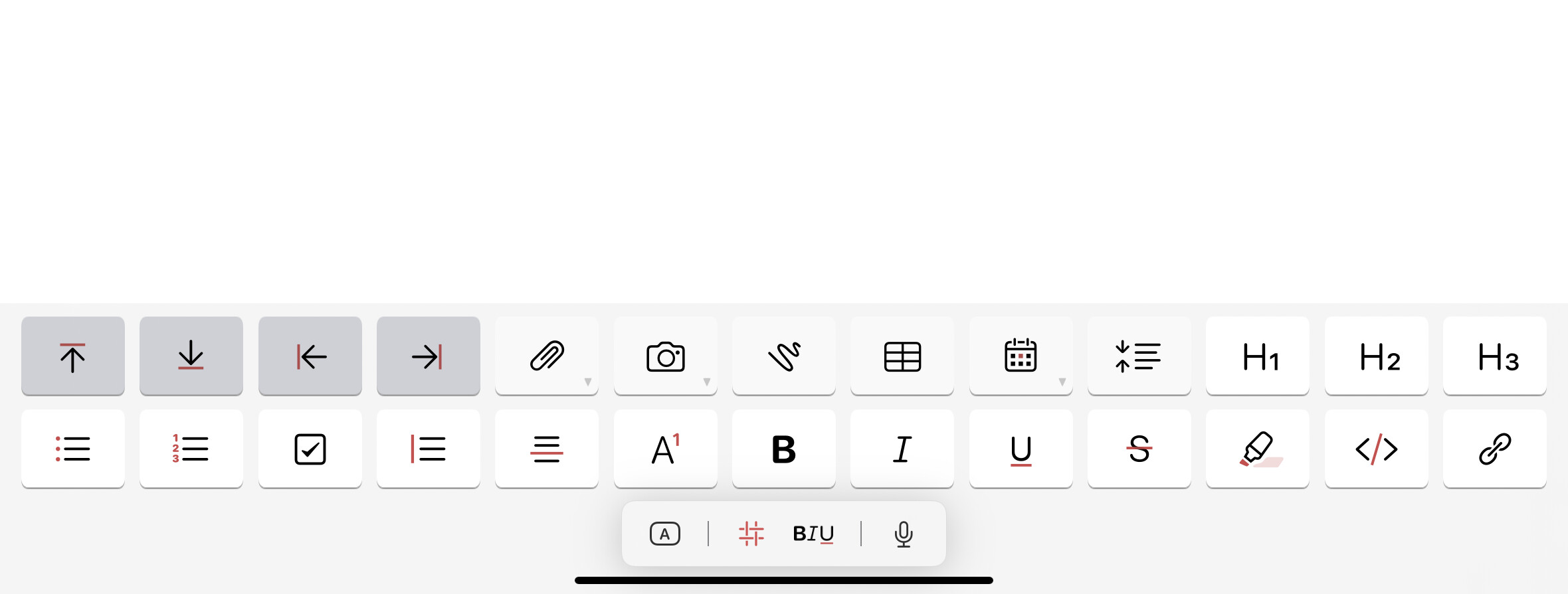 If I disable the ’Shortcuts’ option under iPadOS settings under General → Keyboards (which disables the language bar or whatever the floating keyboard bar is on the newest iPadOS’es) there’s no way to access some of features of the app. I’d gladly use just the physical keyboard as I can type everyhting in Markdown, but then I can’t add images and stuff. There’s no keyboard shortcuts that I know of for inserting attachments, or calling up the formatting bar.