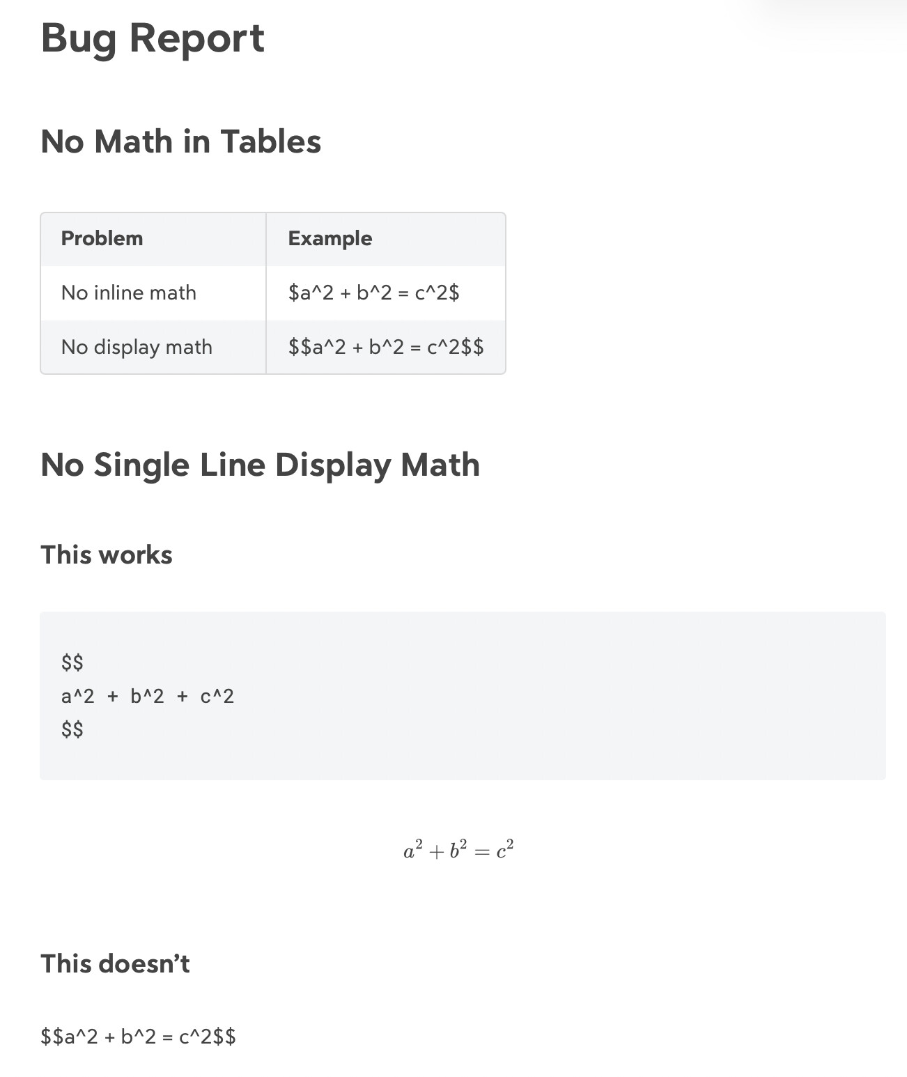 - Math doesn’t render in Markdown tables. Neither inline math $…$ nor display math $$…$$ produce any typesetting inside tables.